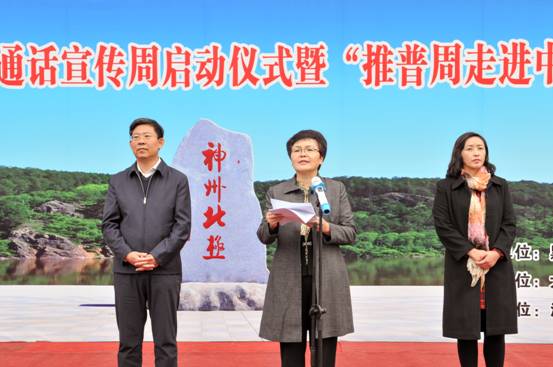 在启动大会上,地区行署副专员蒋迎娟致辞,地区行署教育局局长黄桂林主持会议,北极镇中心校教师王磊代表全校师生向全省人民发出了推广普通话的倡议。