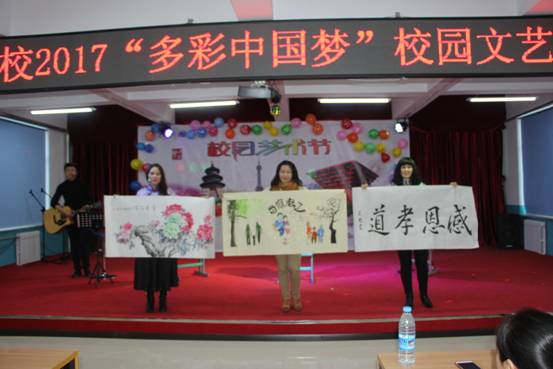 全体学生齐唱我校音乐教师作词作曲的校歌《有梦的少年》,拉开了此次艺术节的序幕。开场舞《喜乐年华》一登台便掌声四起,演员们用欢快的舞步和美妙的舞姿,祝福新的一年,抒写新的期待。由五年级班主任李树石和学生演唱的歌曲《梦中的额吉》歌声悠扬。相声《吹牛》、小品《开学了》不时的把大家逗的哈哈大笑,博得观众的阵阵掌声。一曲《当你老了》,优美、动听、流畅,再加上我校黄顺芬、齐淼、吴艳三位教师的艺术展示,展现了我校丰厚的文化底蕴。活力四射、动感十足的现化舞《sheep+good time》、《cry cry》,健美操《欢乐跳起来》尽情展示了青春的风采,诠释了青春的活力、生命的精彩,更加体现了中学生的蓬勃朝气。钢琴曲《贝加尔湖畔+成都》使人仿佛身临其境。校长国翠霞协同部分教师演唱的歌曲《相信我们会创造奇迹》将演出推向高潮。音乐教师高玉清用一曲《共圆中国梦》,唱出我们的梦想,孩子们用舞动的旋律,跳出我们共同的心声,为整场演出画上了圆满的句号。
