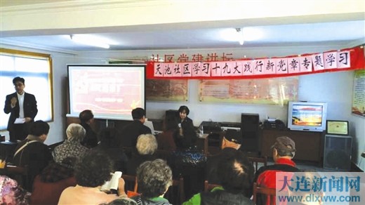 电大党委充分发挥高校思想政治教育阵地优势,制定了《大连电大党的十九大精神进社区宣讲活动方案》,成立了以专业教授为团队的电大党的十九大精神宣讲组,分赴社区,向社区党员宣传党的十九大精神,解读新《党章》。下一步,大连社区大学将 “党的十九大精神”、“习近平新时代中国特色社会主义思想”嵌入《中国特色社会主义理论体系》课堂教学内容,制作课堂教学的微课件,通过通俗易懂、喜闻乐见的形式,宣传党的十九大精神,让老百姓听得懂、能领会,让党的十九大精神深入人心。